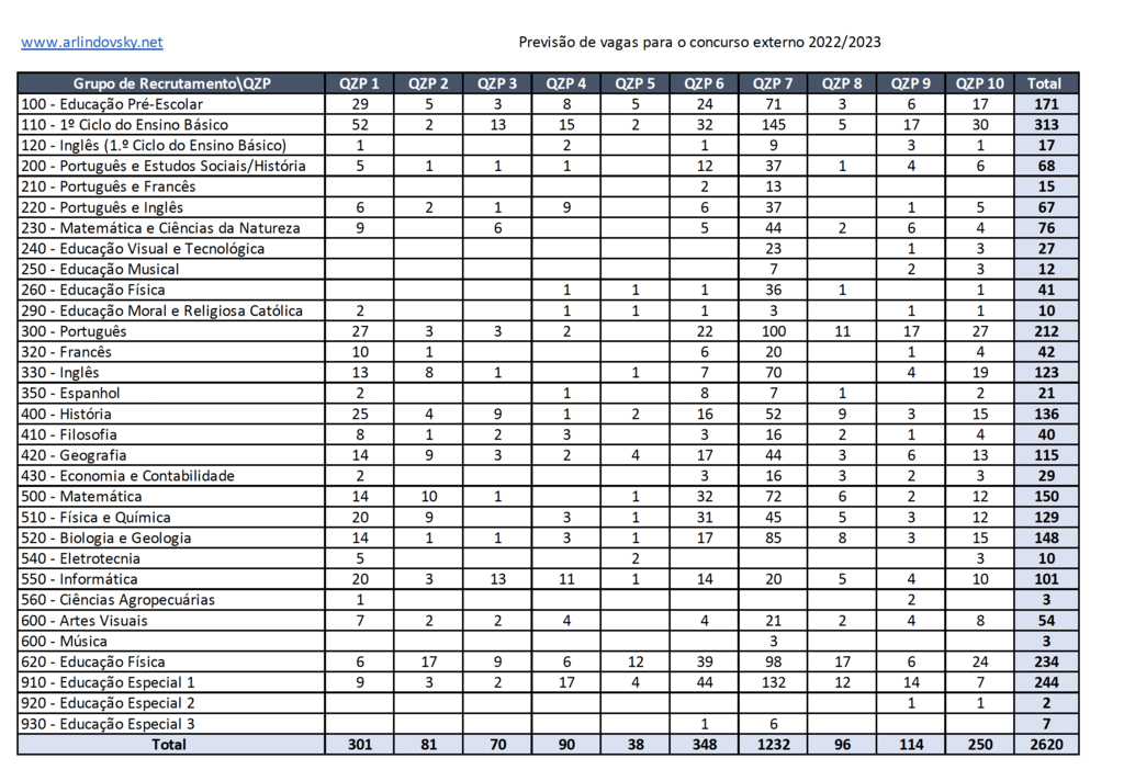 O próximo quadro já foi elaborado em setembro de 2021 com a previsão das vagas a abrir no concurso externo 2022/2023, que serão abertas pelas regras da norma travão.