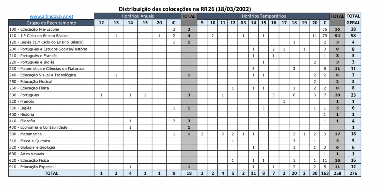 Foram colocados 276 contratados, distribuídos de acordo com a tabela seguinte.