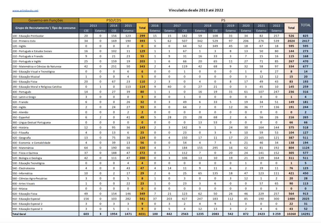 Nos últimos 10 anos vincularam ou estão prestes a vincular pouco mais de 14 mil docentes para os diversos grupos de recrutamento (não considerando os que vincularam para as escolas artísticas).