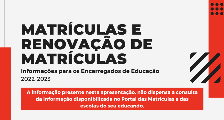 Apresentação simples com informações para os Encarregados de Educação sobre o processo de matrículas 2022/2023.