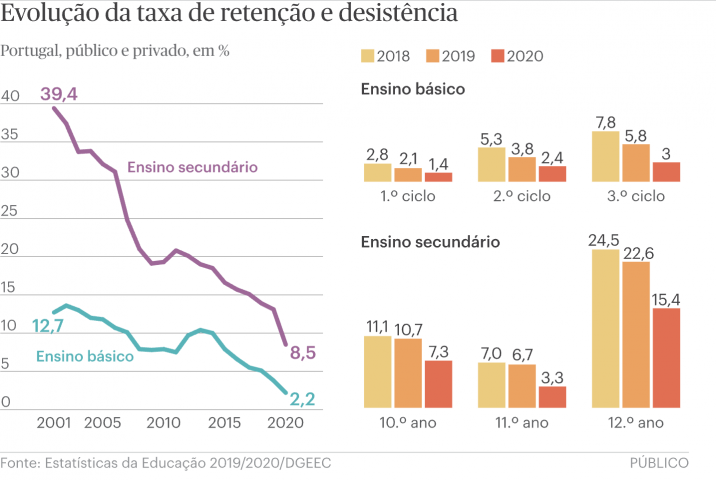 Jornal Público de 3 de Julho de 2022, Ano XXXIII, nº 11.753. “Taxas de retenção e de abandono no ensino básico voltam a níveis anteriores à pandemia.”