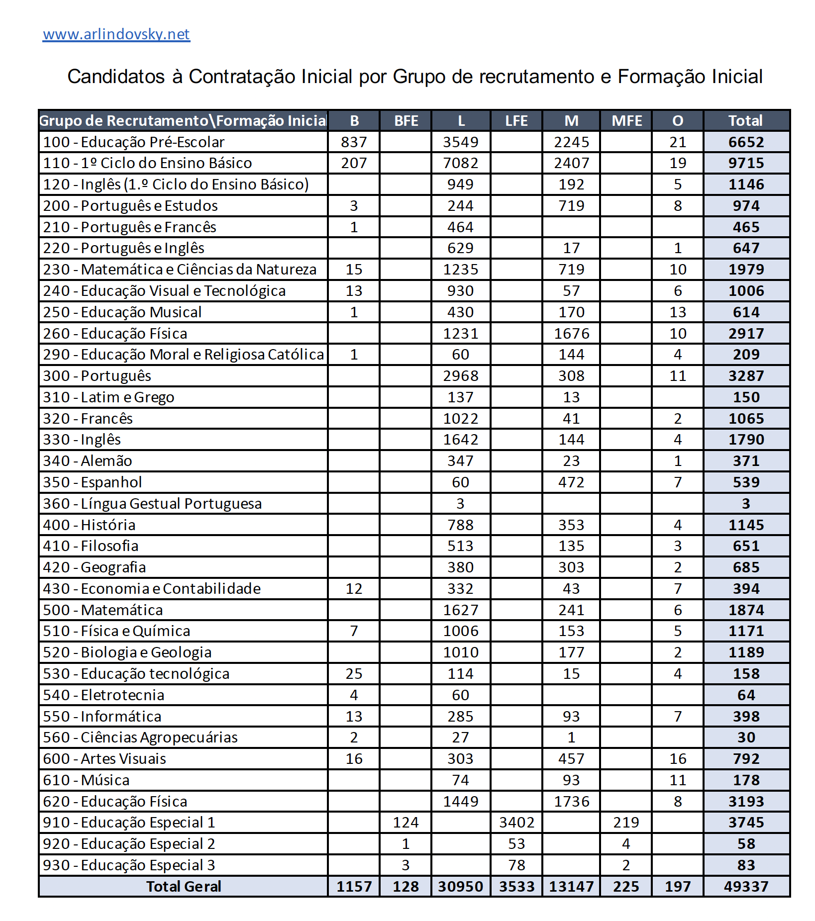 Apuramos pelas listas de ordenação à Contratação Inicial um total de 49.337 candidaturas que se distribuem da seguinte forma por grupo de Recrutamento e Formação Inicial.
