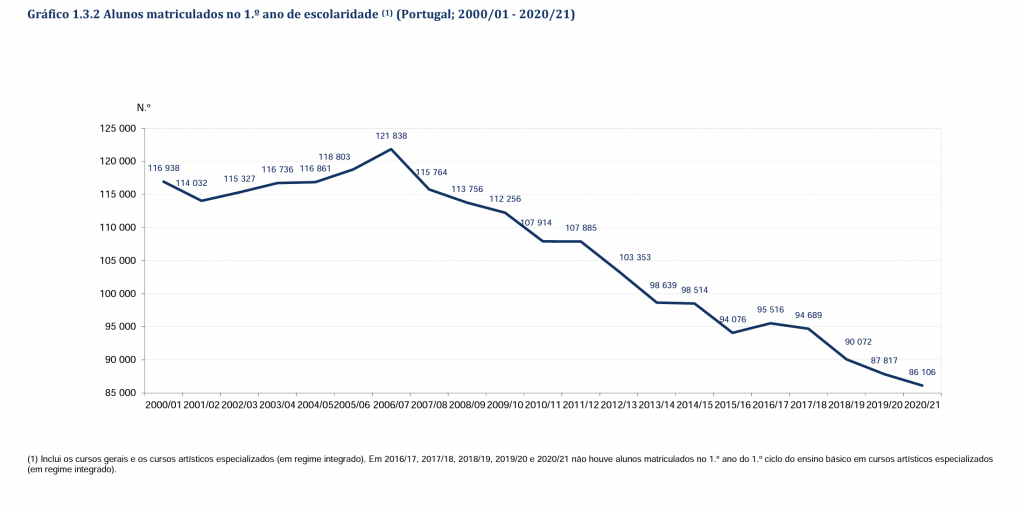 Neste quadro verifica-se a acentuada queda de alunos matriculados no 1.º ano de escolaridade que tem vindo a acontecer em especial desde o ano letivo 2006/2007, onde pela primeira vez neste século o número de matrículas no 1.º ano do ensino básico se situou acima das 120 mil matrículas.