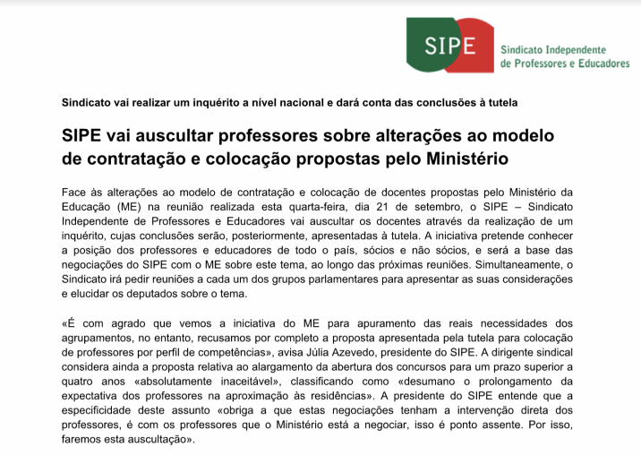 As reuniões negociais para discutir o novo modelo de recrutamento e colocação de docentes serão retomadas no final do mês de outubro, ainda sem data definida.