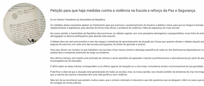 Os cidadãos abaixo assinados apelam ao Parlamento para que promova o questionamento do Governo e debata o tema, para que se chegue à tomada de medidas executivas, regulamentares e legislativas, para abordar de forma mais eficaz o problema da violência e falta de segurança em meio escolar.