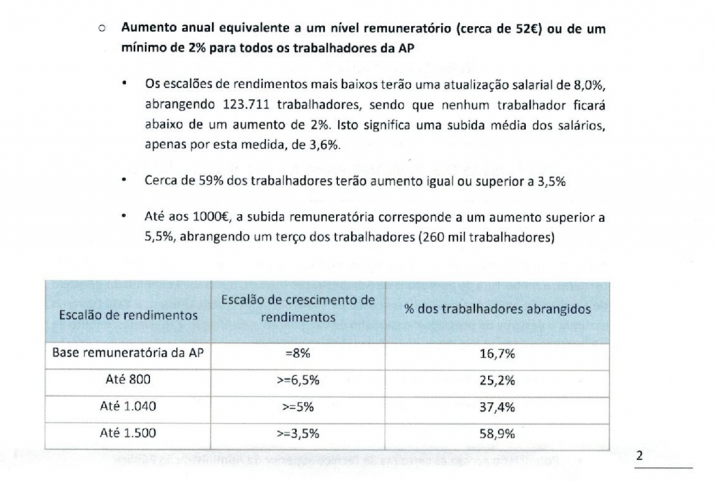 O salário mínimo da função pública vai subir 56,58 euros (de 705 para 761,58 euros), os trabalhadores com salários brutos até 2600 euros terão um aumento de 52,11 euros e os restantes funcionários terão uma actualização mínima de 2% no próximo ano. Estas são as linhas gerais da proposta que a ministra da Presidência, Mariana Vieira da Silva, está a apresentar nesta segunda-feira aos sindicatos da Administração Pública.
