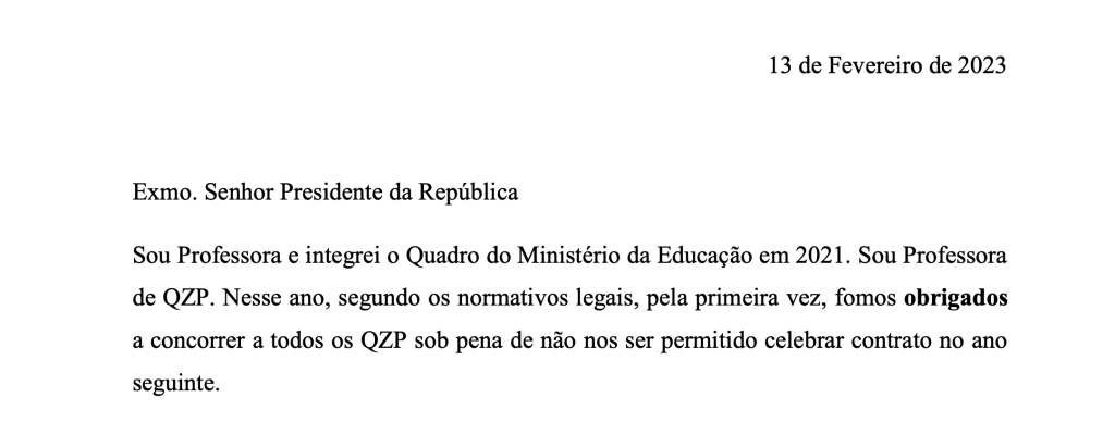 O professorado muito agradece e diz muito obrigado a esta cidadã anónima, do povo, que ao contrário do Governo, do Ministério da Educação (ME), e de alguns políticos (que representam o partido e não o povo e muitos professores que os elegeram), percebe o que está a acontecer/acontecendo. Senti um estremecimento e a responsabilidade redobrada. Desistir não é opção. Falhar está fora de questão. A luta É para continuar até à vitória final, com o Acordo de todos os acordos negociado entre a tutela e o professorado. Necessário é plasmar tudo num novo Estatuto da Carreira Docente (ECD). Dar resposta a todas as linhas vermelhas. Dinheiro não é problema quando há vontade política. Falemos, dialoguemos, admitamos um calendário faseado, mas sem mandar para as calendas gregas. Até porque, se alegadamente, só para a Efacec, o Estado injecta todos os meses 10 milhões de euros (Camilo Lourenço, comentário hoje, 13 de fevereiro de 2023, na CMTV), os docentes há duas décadas que vêm empobrecendo e perdendo salário real e poder de compra.