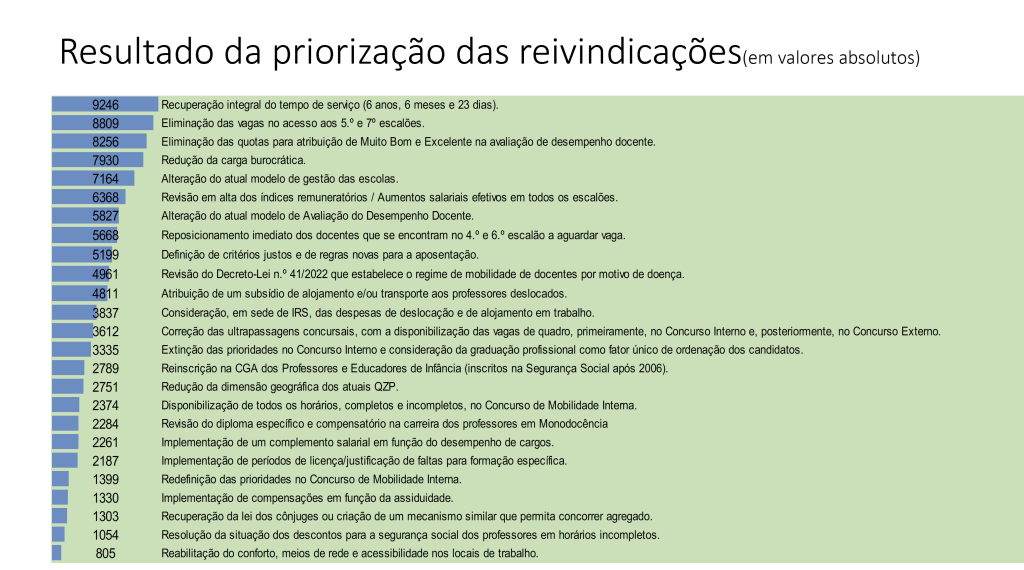 Como seria de esperar, a recuperação dos 6A6M23D é a prioridade principal dos docentes nas suas exigências, seguindo-se a eliminação das vagas de acesso ao 5.º e 7.º escalões.
