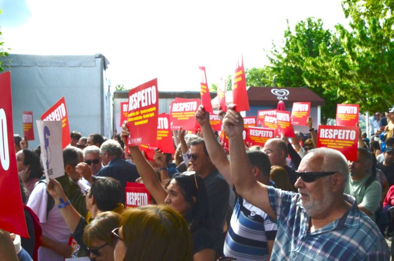 Os professores presentes exibiram cartazes exigindo “Respeito” e t-shirts em que, para além daquela exigência, constava uma referência aos 6A 6M 23D de trabalho que faltam recuperar.