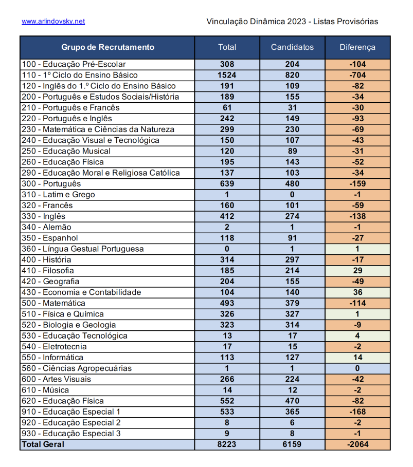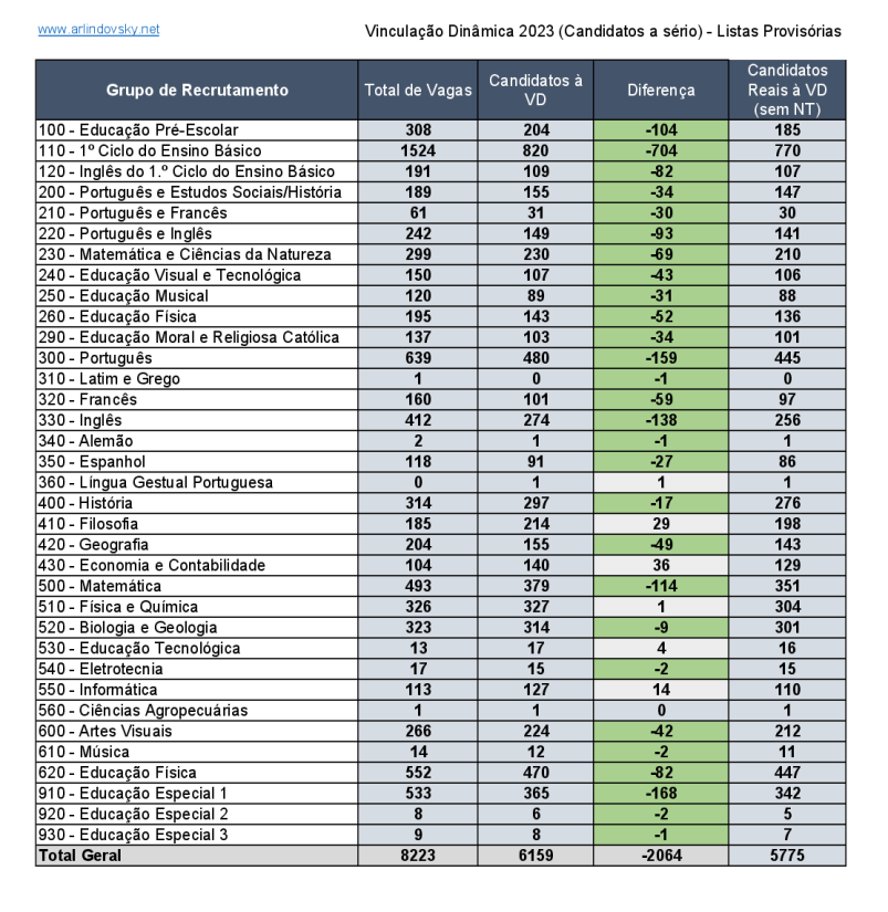 Das 8223 vagas que abriram para a vinculação dinâmica candidataram-se 6159 docentes. Em alguns grupo candidataram-se mais docentes do que as vagas que foram abertas (isto é sinal que as vagas que abriram não foram corretamente apuradas).