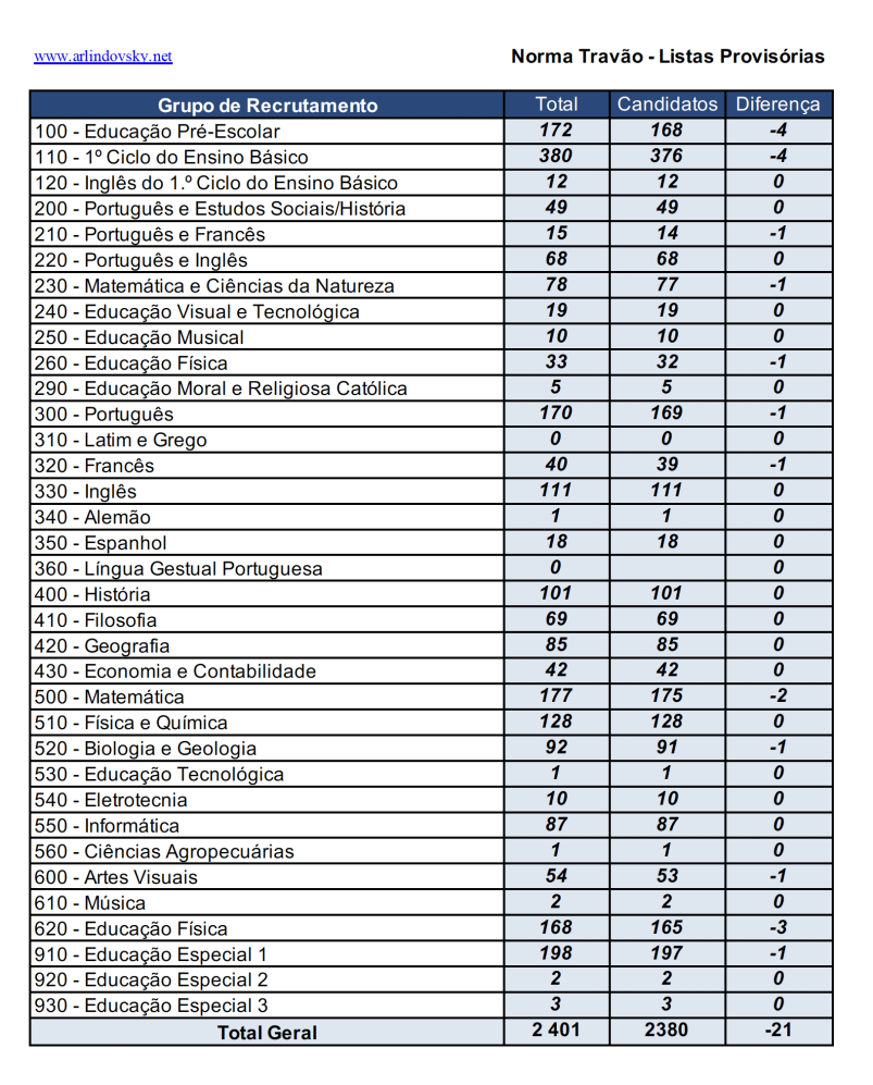 Das 2401 vagas abertas, candidataram-se (com candidatura validada) 2380 docentes. Faltam apenas 21 candidatos que podem ainda estar na lista de excluídos e que reclamem destas listas.