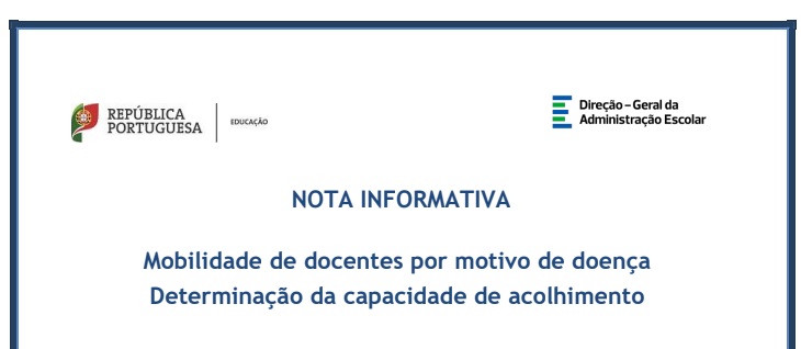 No âmbito do regime de mobilidade de docentes por motivo de doença 2023/2024, será disponibilizado no SIGRHE entre os dias 29 de junho e o dia 3 de julho, o módulo destinado a indicar a capacidade de acolhimento de cada Agrupamento de Escola/Escola não Agrupada, nos termos do artigo 7.º do Decreto-Lei 41/2022, de 17 de junho de 2022.