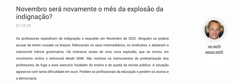 O professor finge o que não sente e representa o que não é. Viola violentamente a sua própria consciência, com a ética deontológica em conflitualidade, e vê a sua axio-profissionalidadeconspurcada, numa miríade de tarefeiro-estafeta “burrocrático”. Princípio e insulto destruidor da auto-estima. A profissão não é mais fruição, atracção, valorização e realização pessoal. Para mais, quando é o próprio ministro da Educação, João Costa, a assumir publicamente que apenas 50% dos professores poderiam sonhar alcançar os três últimos escalões da carreira.