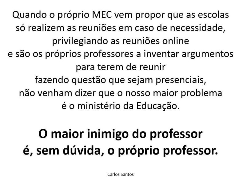 Após alguns meses, em que parecia que os Professores já não estariam dispostos a aceitar a adaptação incondicional às imposições do mundo, leia-se da Tutela, eis que, no momento presente, a esmagadora maioria dos Professores parece ter-se novamente resignado e retrocedido ao habitual excesso de sensatez…