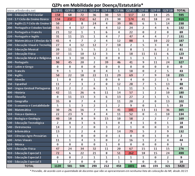 Analisando a tabela, percebemos que é nos QZPs 1 e 7 onde existem mais professores nestas circunstâncias (são aqueles que têm também mais professores). O meu palpite é que a Sul há mais mobilidades por doença, enquanto a Norte imperam as mobilidades estatutárias.