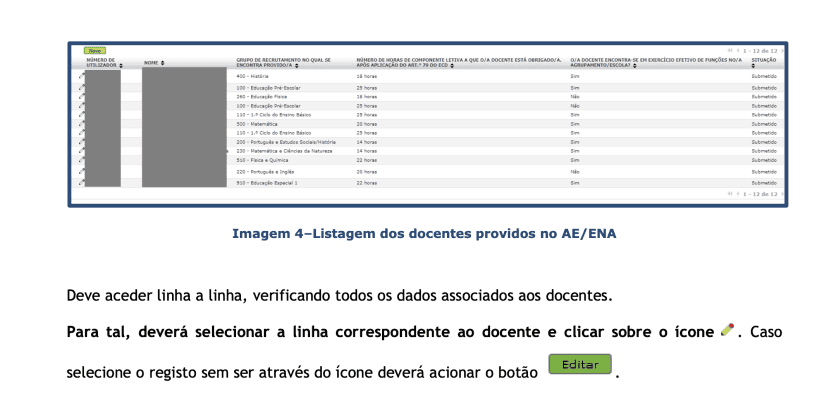 De acordo com o Manual de Instruções para se passar à fase do apuramento de Vagas é necessário concluir o número de alunos por ano de escolaridade e verificar todos os dados associados aos docentes (Imagem 4).