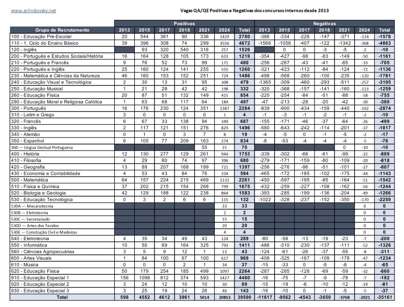 A análise que eu faço ao concurso interno de 2024 é que o número de vagas positivas de QA/QE é tão elevado este ano que poderá permitir uma enorme mobilidade dos docentes dos quadros ao mesmo tempo que poderá integrar na carreira mais docentes do que inicialmente estavam previstos pela norma travão e pela vinculação dinâmica.