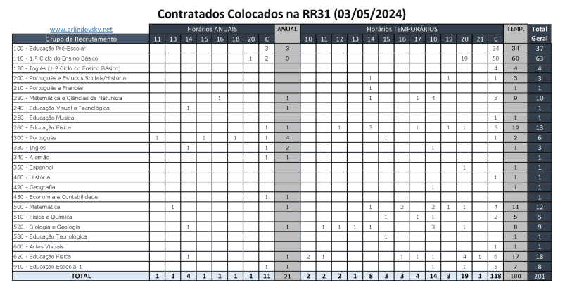 Foram contratados 201 professores contratados na Reserva de Recrutamento 31, distribuídos de acordo com a seguinte tabela: