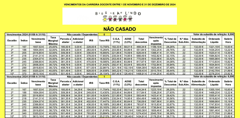Ora, pela tabela apresentada, um professor do 2.º escalão (2 titulares), com 3 dependentes vai receber, em novembro e dezembro, de acordo com as tabelas apresentadas, 1 498,13€, líquidos, incluindo o subsídio de refeição.