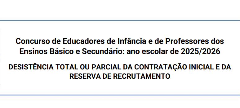 Encontra-se disponível a aplicação eletrónica que permite ao docente proceder à desistência total ou parcial de contratação inicial e da reserva de recrutamento, até às 18:00 horas do dia 8 de agosto de 2025 (hora de Portugal continental).