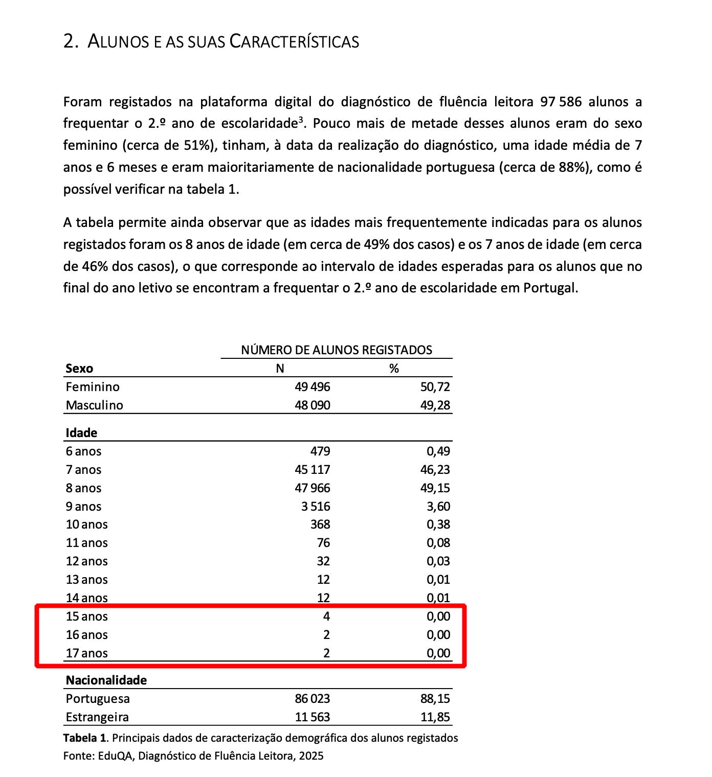 Não posso deixar de ficar espantado com o 1.º quadro do relatório com o universo de alunos do 2.º ano que realizaram esta prova porque sempre pensei que o limite de idade no 1.º ciclo fossem os 14 anos.