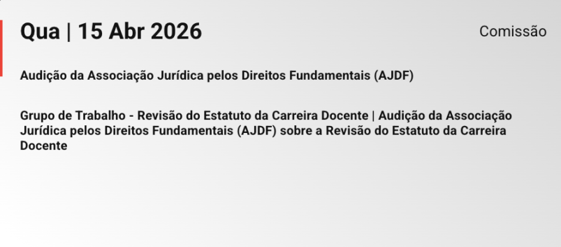 A *AJDF*, *hoje, pelas 14 horas*, será ouvida *na Assembleia da República, na Comissão Parlamentar de Educação e Ciência* (CEC), no âmbito do Grupo de Trabalho constituído para o *processo de revisão do Estatuto da Carreira Docente (ECD).*