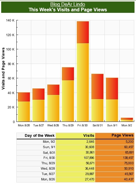 Foram 107896 mil visitas que visualizaram 138457 páginas, que mesmo assim ficaram atrás das 120420 visitas e 151842 páginas vistas do dia 31 de Agosto de 2012.