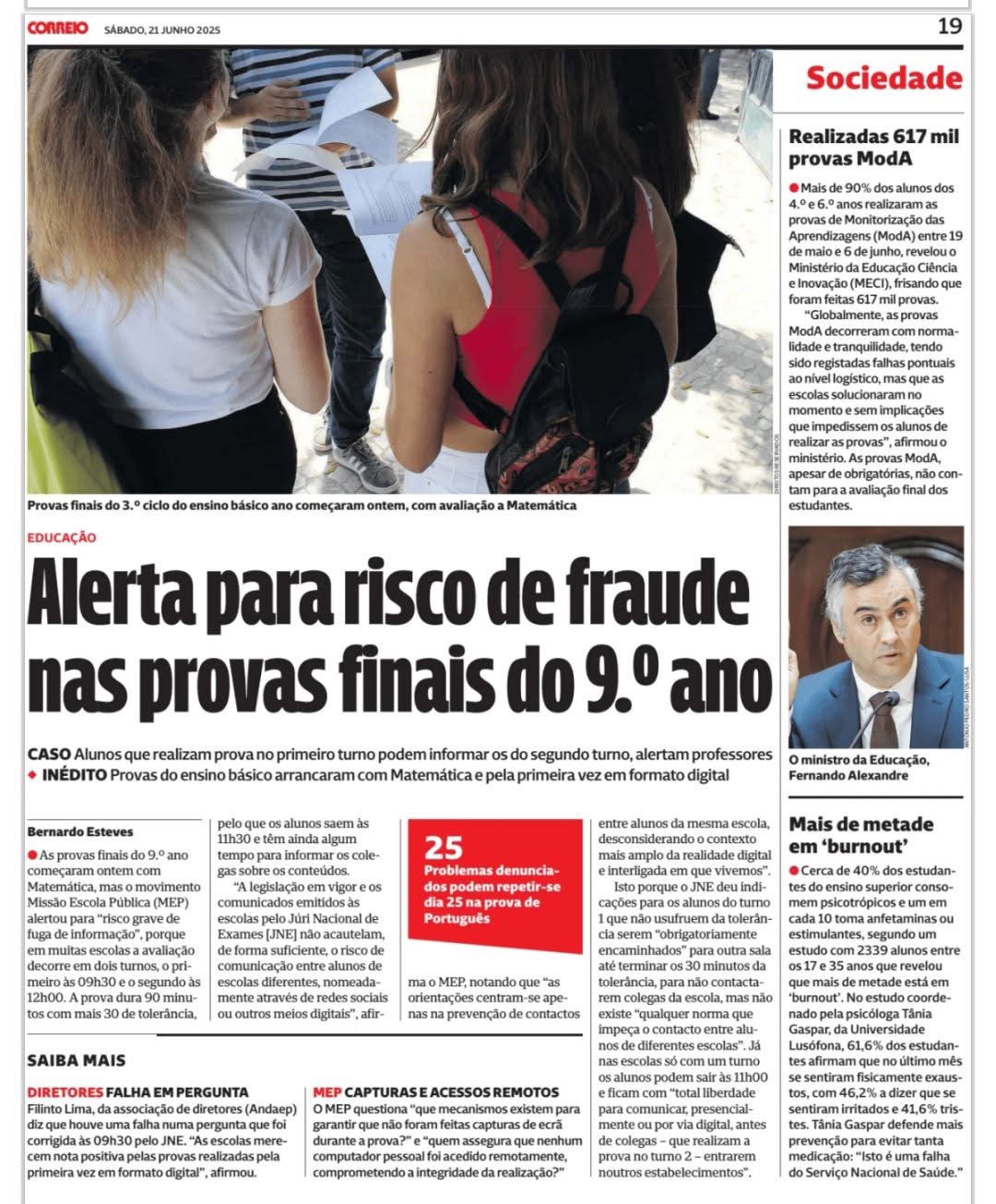 O ministro da Educação, Ciência e Inovação, Fernando Alexandre, confirmou que alguns agrupamentos de escolas reportaram “problemas técnicos” durante a realização da prova de Matemática do 9.º ano, sublinhando que “nenhum aluno será prejudicado na sua avaliação”.