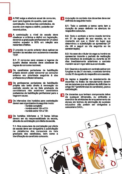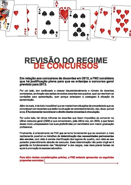 Foi depois desta iniciativa da FNE que o MEC promoveu a apresentação de uma proposta sua para uma revisão global do regime de concursos de docentes, cumprindo desta forma o acordo celebrado com a FNE em 9 de setembro passado, aquando da revisão do regime de avaliação de desempenho.