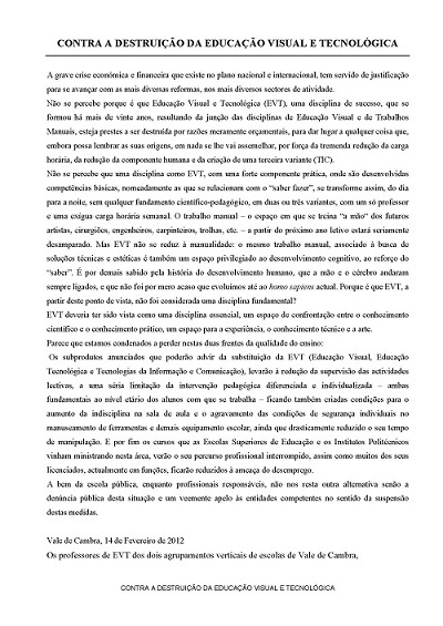 Petição pela continuação da disciplina de Educação Visual e Tecnológica no segundo ciclo, discutida no dia 7 de Março.