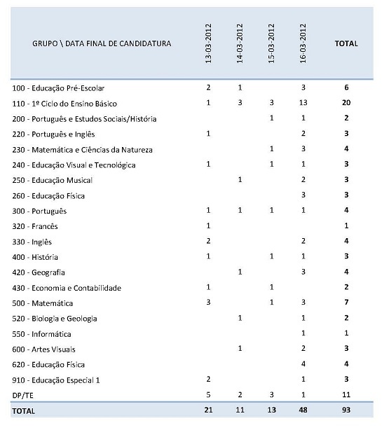 Tem havido alguma flutuação nos prazos finais de candidatura de alguns horários pelo que não tem sido fácil conseguir elaborar uma lista fidedigna dos horários a concurso neste segundo período, para isso tenho de verificar horário a horário. Para compreenderem esta situação apresento um quadro com o número de horários em concurso por dia e verifiquem que o prazo final de candidatura é alterado a meio de concurso. A situação mais flagrante acontece com os horários que terminam amanhã o prazo para candidatura, ao todo são 260 horários, e que durante o dia 13 passaram o prazo final do dia 17 para o dia 16.