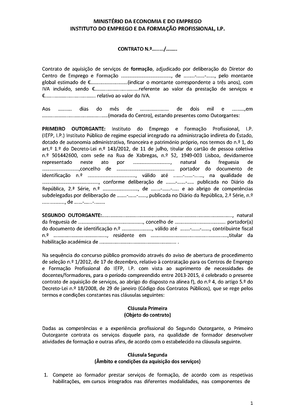 Sou formador/a do Centro de Formação Profissional de X, colocado/a na sequência do concurso público promovido através do aviso de abertura de procedimento de seleção n.º 1/2012, de 17 de Dezembro, relativo à contratação para os Centros de Emprego e Formação Profissional do IEFP, IP e pretendo, por este meio, esclarecer junto de V.ª Ex.ª algumas dúvidas que me têm assolado, bem como a bastantes dos meus colegas.