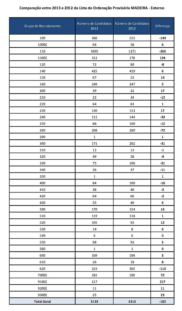 Depois de analisar melhor as listas provisórias da Madeira e por me ter chegado um alerta por mail do significado da 3ª coluna (nº de preferência do grupo de recrutamento), concluí que este ano candidataram-se menos 732 docentes ao concurso Externo da Madeira do que no ano passado.