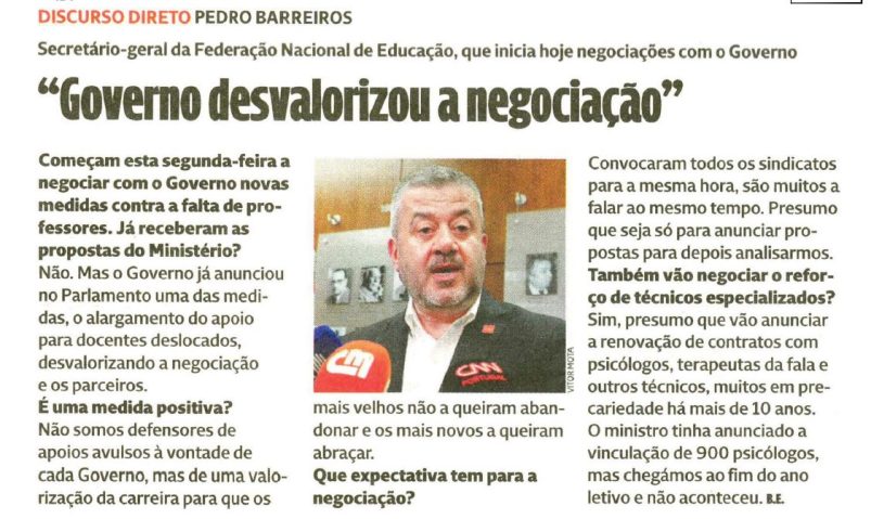 O líder da Federação Nacional de Educação (FNE), Pedro Barreiros, ficou à porta e recusou participar, esta segunda-feira, na reunião entre a equipa do Ministério da Educação e as estruturas sindicais.