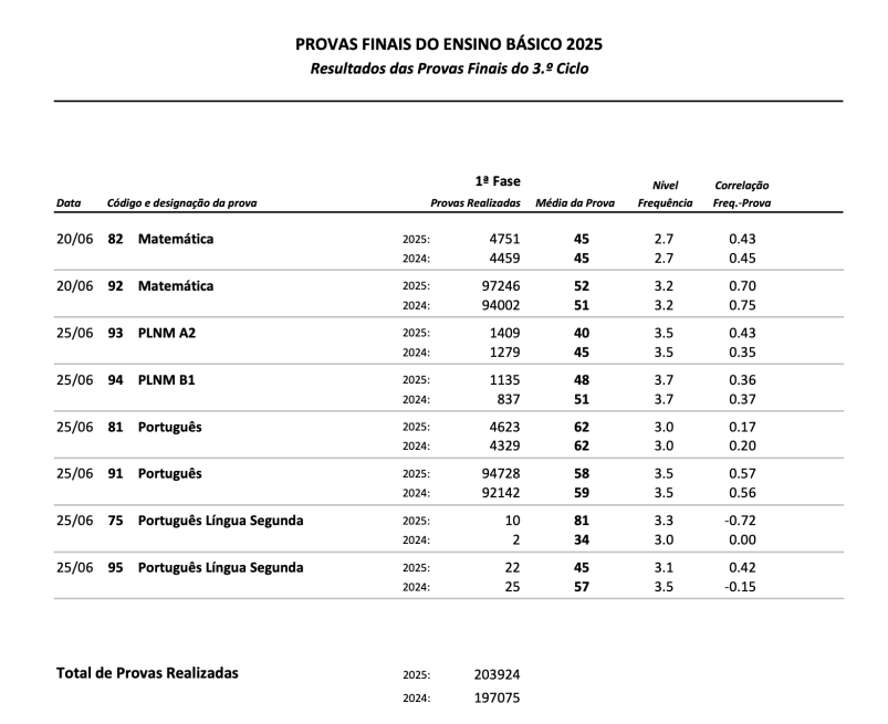 Apesar do novo formato, que fez com que as provas fossem realizadas, pela primeira vez, em suporte electrónico em todo o país, as médias nacionais dos exames do 9.º ano do ensino básico divulgadas nesta quarta-feira mantêm-se “alinhadas” com as do ano passado: na prova de Matemática a média é de 52 pontos (mais um ponto do que em 2024); na de Português é de 58 pontos (menos um).